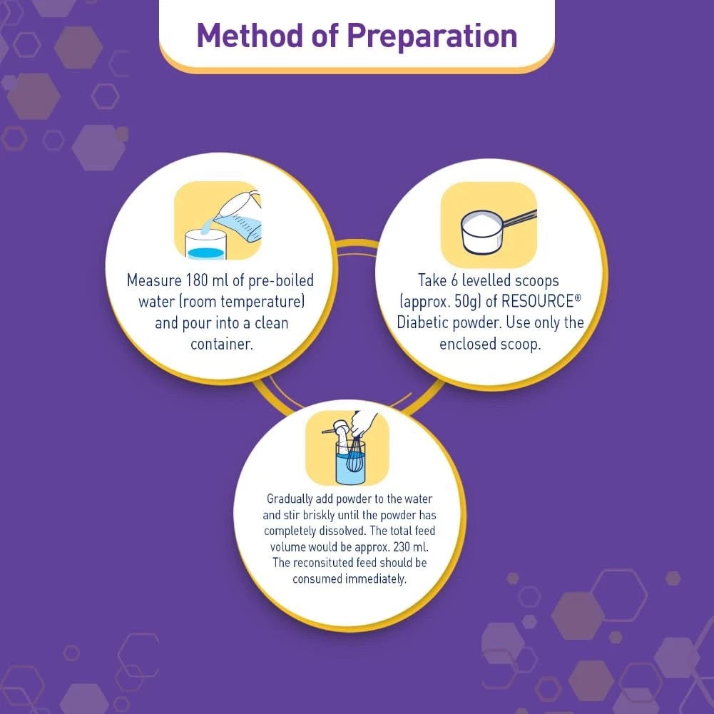 • 1. RESOURCE DIABETIC contient 22 g de protéines pour 100 g de poudre et contient des fibres alimentaires.