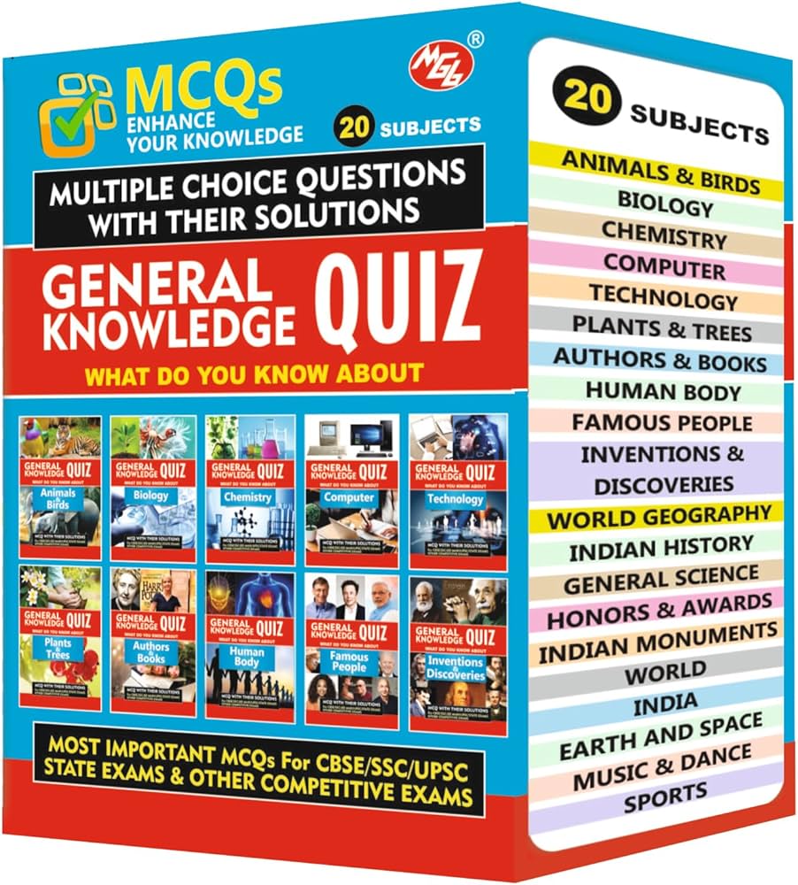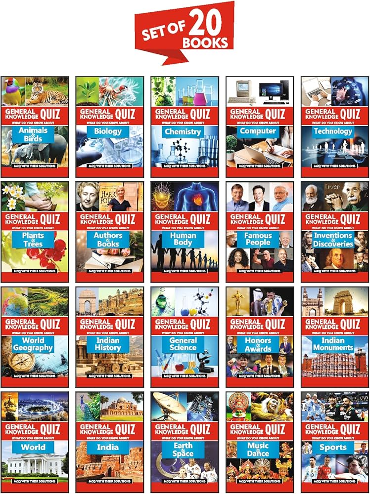 Questo set offre agli aspiranti una serie di domande di cultura generale, suddivise per argomento, con le relative risposte. Le domande si basano su chimica, biologia, libri e autori, piante e alberi, animali e uccelli, scienze generali, tecnologia, corpo umano, computer, riconoscimenti e premi, luoghi famosi, costituzione indiana, storia e cultura, ecc. Questi quiz a risposta multipla di cultura generale ti aiuteranno in vari colloqui, concorsi o esami di ammissione. Set di 20 libri: animali e uccelli, biologia, chimica, informatica, piante e alberi, autori e libri, corpo umano, personaggi famosi, invenzioni e scoperte, geografia mondiale, storia indiana, scienze generali, riconoscimenti e premi, monumenti indiani, India del mondo, terra e spazio, musica e danza, sport.