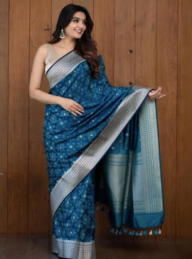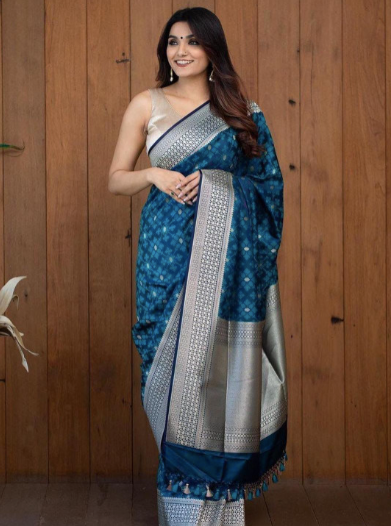 Navy blue and silver-toned Banarasi saree