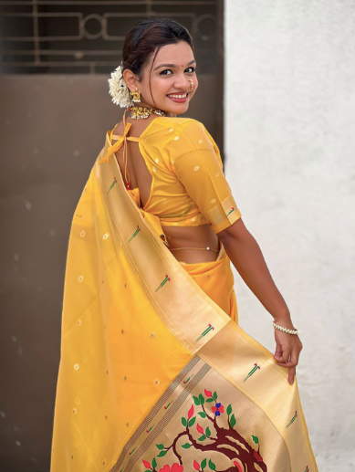 5. Yellow & Blue Paithani Saree — Organza